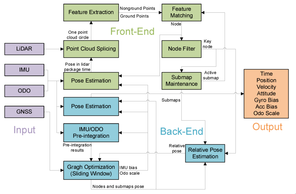图 1 GNSS IMU ODO LiDAR SLAM 集成导航系统的系统概览。