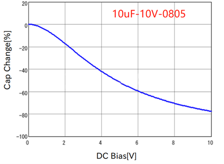 However, the capacitance value calculated using the above formula resulted in a larger output ripple during actual testing. Why is this? This is because MLCC (Multi-Layer Ceramic Capacitors) have a DC bias characteristic: applying a DC voltage to the capacitor reduces its capacitance.