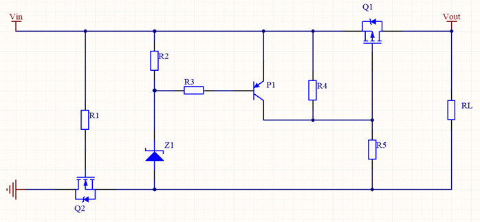 Its overvoltage protection function is analyzed as follows: When Vin is in the normal input voltage range, the voltage regulator Z1 does not reversely break down, the current of R2 and R3 is basically 0, the Vbe of the transistor P1 is 0, that is, the PNP transistor is not turned on, and the Vgs of the PMOS tube Q1 is determined by the voltage divider of resistors R4 and R5. Vgs is greater than the conduction threshold, and the PMOS tube is turned on, that is, the power supply works normally; when the Vin input is greater than the normal input voltage, at this time Vin>Vbr, the voltage regulator is broken down, the PNP transistor Q1 is turned on, VCE≈0, that is, the Vgs of the PMOS tube is ≈0, and the PMOS tube is turned off, that is, overvoltage protection is achieved.