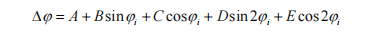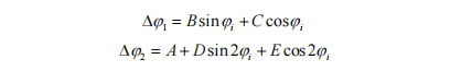 在哪里 ϕi 为航向角测量值,A、B、C、D 和 E 为误差系数。通过上述罗盘误差分析可知,电子罗盘的总罗数应为上述误差的代数和。因此,结合公式 (1) 和 (2) 求得总差值。 ∆ϕ