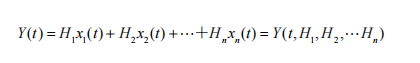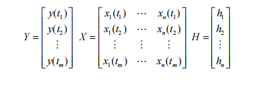 其中 H1, H2, ..., Hn 为 n 个待确定的未知参数,x1(t), x2(t), ..., xt(t) 为已知的确定性函数,例如 t 的正弦函数和余弦函数。假设在时间 t1, t2, ..., tn 进行 m 次 y 和 x 的测量,希望通过估计变量 y 和 x1(t), x2(t), ..., xt(t) 的值来实现。那么公式 (4) 可以表示为矩阵形式:Y = X * H