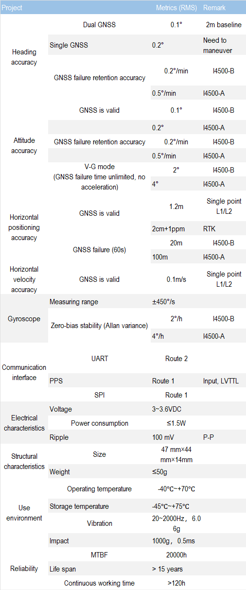 I4500 integrated navigation system has built-in high-performance MEMS gyroscope and accelerometer, which can receive external GNSS data, realize multi-sensor fusion and integrated navigation algorithm, and have short-term inertial navigation capability when GNSS is invalid.
