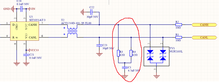 We often see the design circuit shown in the figure below in CAN communication: the CAN terminal resistor does not directly use 120 ohms. Instead, a grounded capacitor is added between two 62Ω resistors to "split" the terminal resistor into two parts, which is the split termination method.